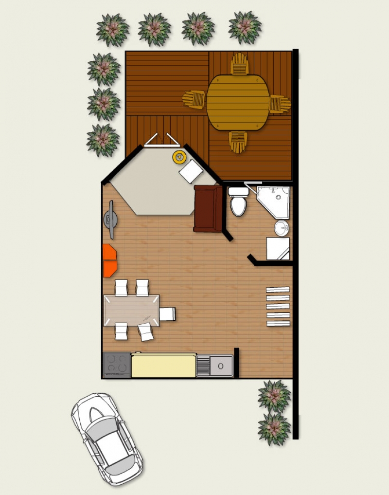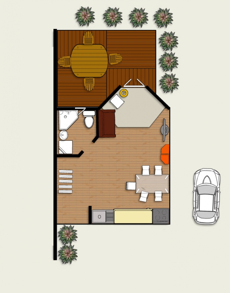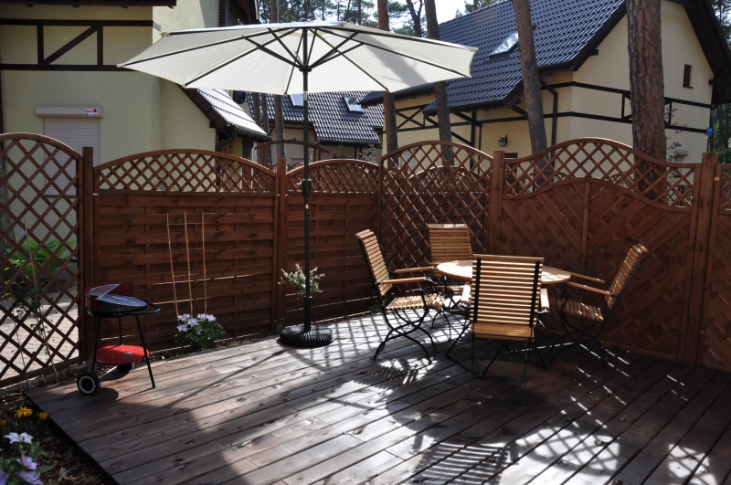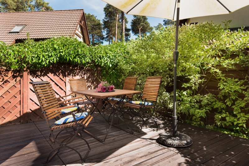 Privater Außenbereich mit Holzgarnitur & Sonnenschirm