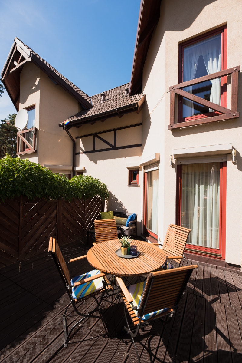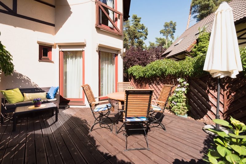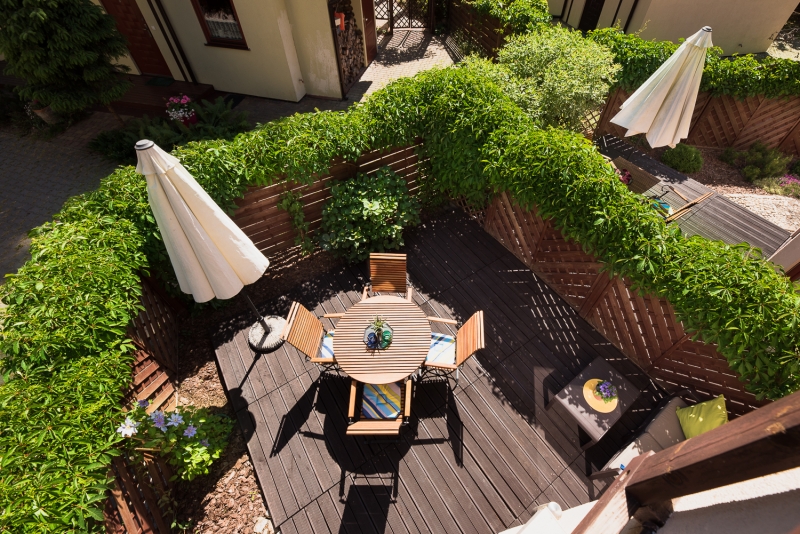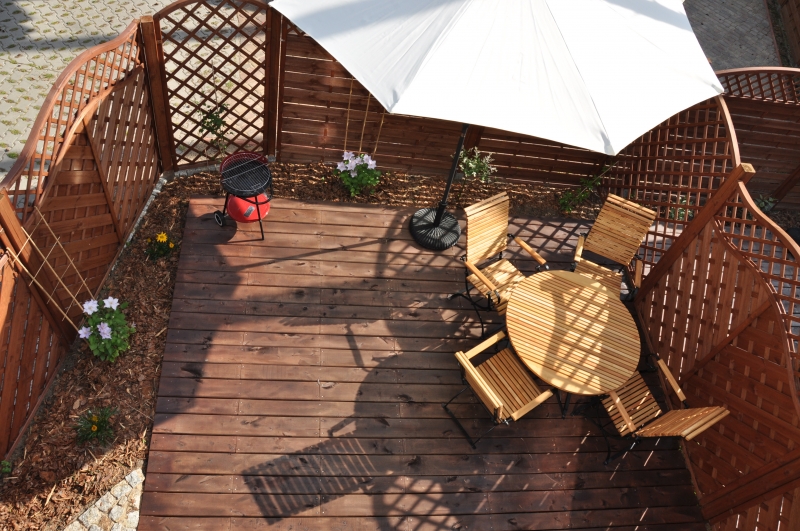 Privater Außenbereich mit Holzgarnitur & Sonnenschirm