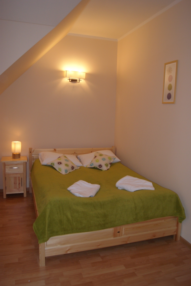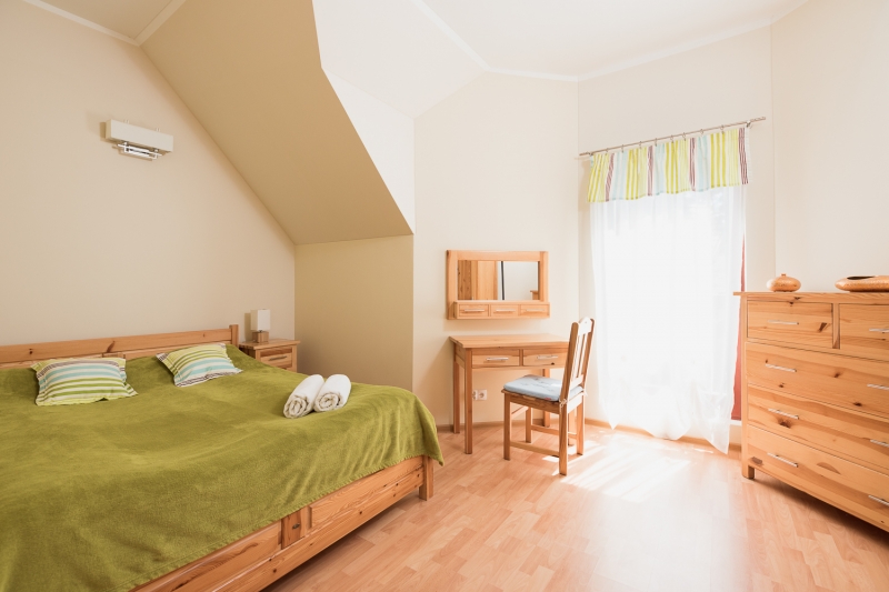 Frisch bezogenes Doppelbett für erholsamen Schlaf